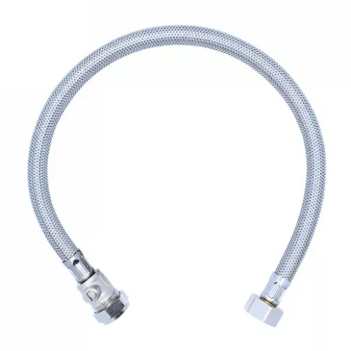 A 150mm long stainless steel braided flexible hose with a 15mm isolator compression fitting at one end and a 1/2" female bsp thread at the other end. This hose has a 10 bar working pressure and a working temperature from -5°C to 90°C.