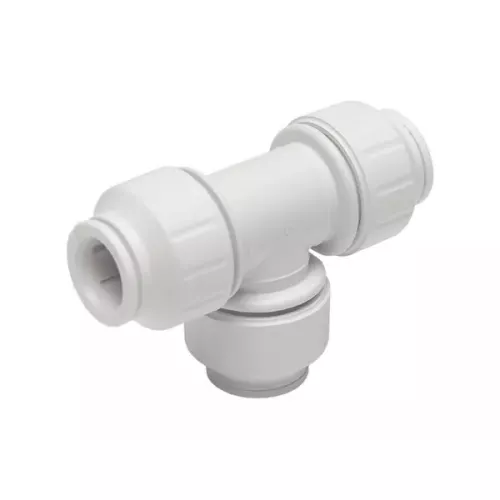 JG Speedfit equal tee push-fit fitting for the connection of three equal sized plastic or copper pipes. Simply push the push-fit fitting fully onto the pipe and twist the plastic nut clockwise to lock in place. To demount the connection, unlock the nut by hand and push the collet towards the body of the push-fit fitting and pull the pipe to release.