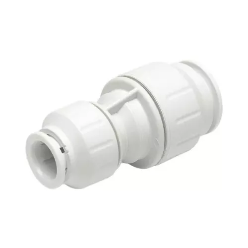 JG Speedfit reducing straight connector push-fit fitting for the connection of two equal pipe sizes. Simply push the push-fit fitting fully onto the pipe and twist the plastic nut clockwise to lock in place. To demount the connection, unlock the nut by hand and push the collet towards the body of the push-fit fitting and pull the pipe to release.