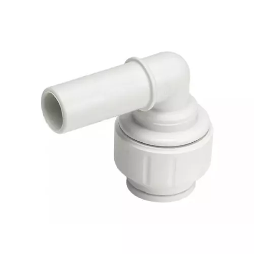 JG Speedfit stem elbow push-fit fitting for the connection of two equal sized Speedfit push-fit fittings to create a 90° swivel type connection. The stem elbow allows a 90° male to female connection making it an ideal coupler for appliances such as cold water storage tanks. Simply push the push-fit fitting fully onto the pipe and twist the plastic nut clockwise to lock in place. To demount the connection, unlock the nut by hand and push the collet towards the body of the push-fit fitting and pull the pipe to release.