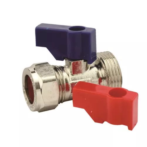 15mm Chrome plated brass washing machine straight connector - supplied with pre-loaded olive in nut. Supplied with interchangeable red and blue levers. Suitable for hot and cold water supply.