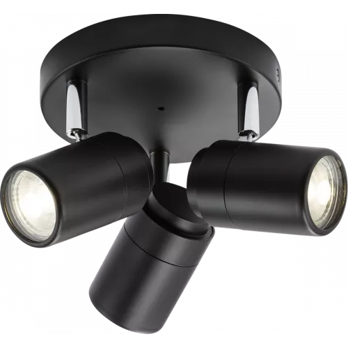 Triple IP44 GU10 spotlight, in a smooth matt black finish. Ideal for domestic and commercial use. Also available in single and triple bar spotlight, in matt black, matt white and polished chrome finish.