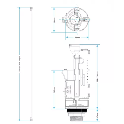 The long‑cable design provides greater installation freedom, making it ideal for concealed cisterns, furniture units, and setups where the button position is offset. The valve features fully adjustable dual flush volumes, allowing precise water‑saving control, while the internal adjustable overflow provides added safety and compliance.