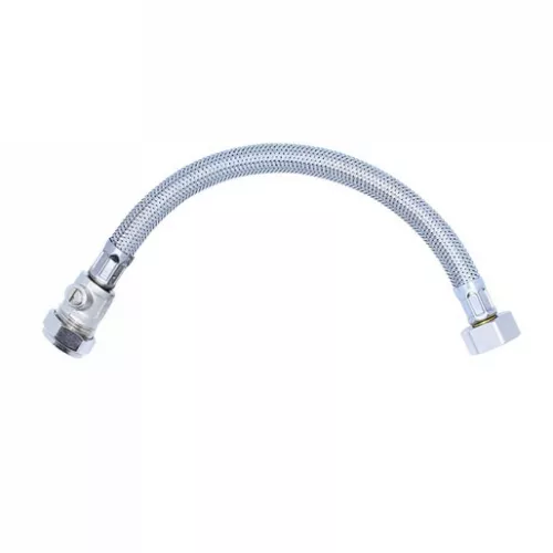 - A 300mm long stainless steel braided flexible hose with a 15mm isolator compression fitting at one end and a 1/2" female bsp thread at the other end. This hose has a 10 bar working pressure and a working temperature from -5°C to 90°C.